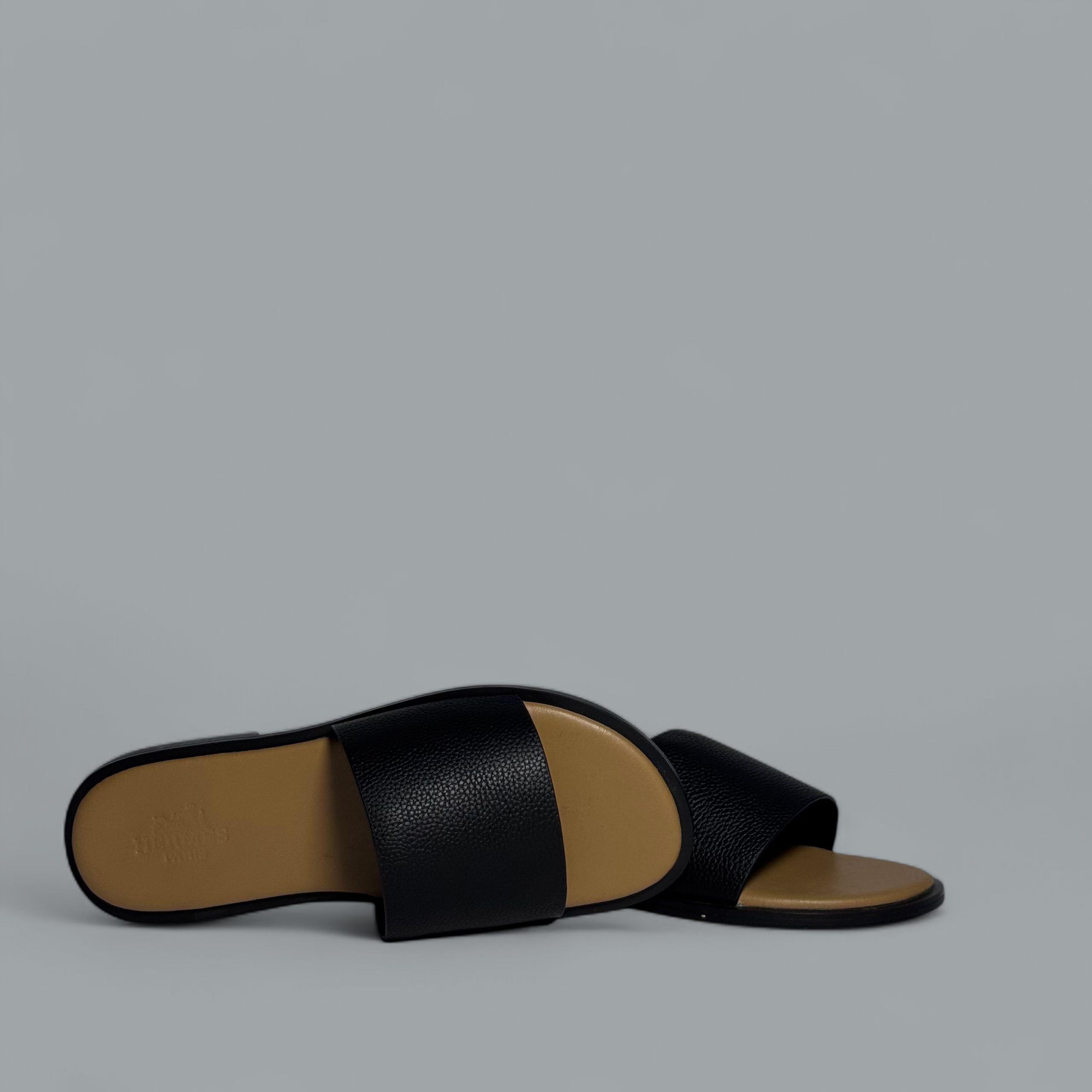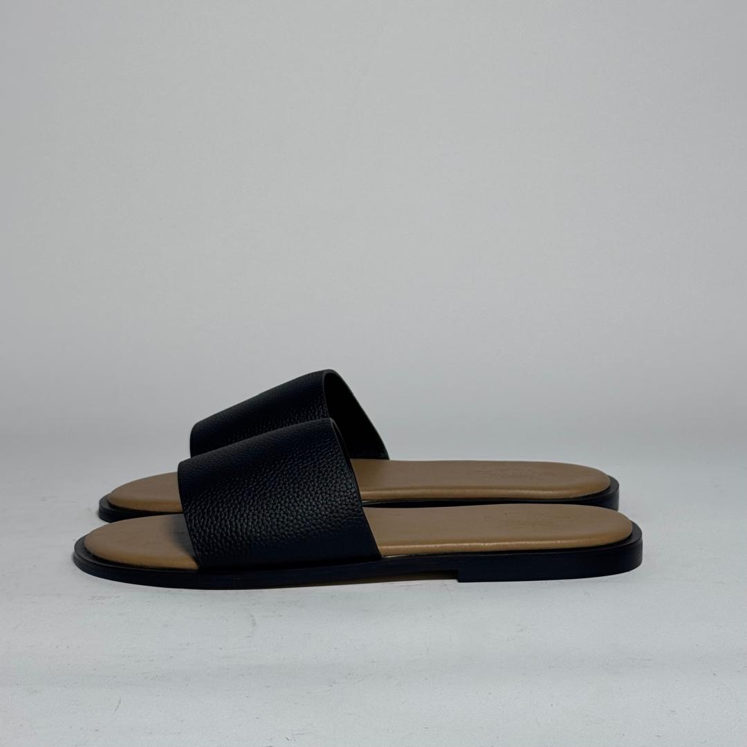 Refined and understated, these Hermès slides are made from textured black leather with a soft tan insole. Lightweight yet durable, they’re a timeless addition to any luxury footwear collection, ideal for relaxed summer wear.