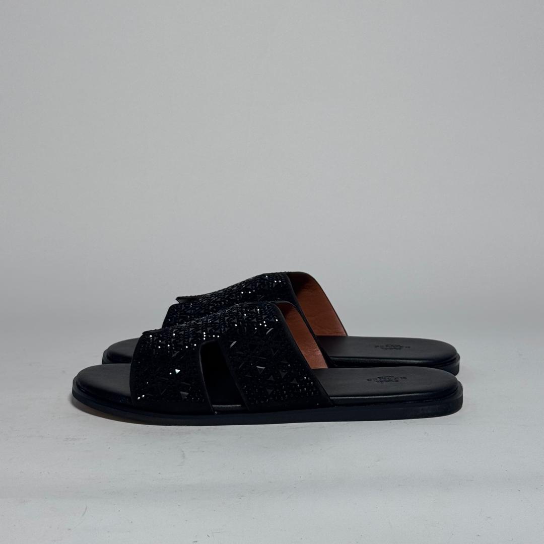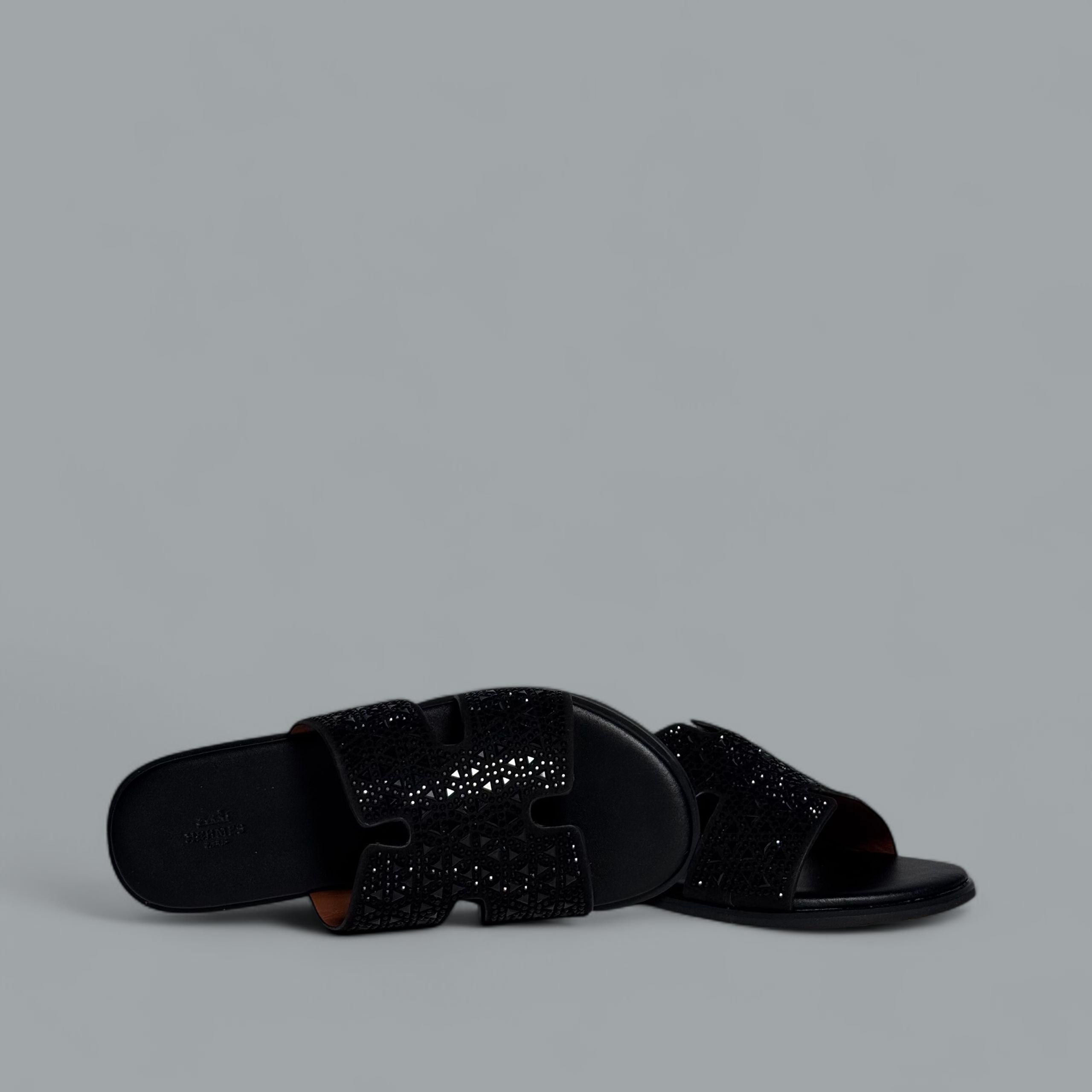 A bold twist on the classic Hermès slide, this pair features intricate cut-out detailing for a striking look. Designed in premium black leather, they combine comfort with elevated luxury, perfect for both day and evening wear.